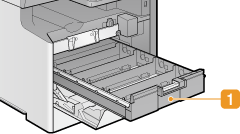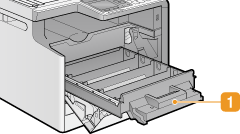 トナーカートリッジをセットします。各スロットに奥から手前に向かって、Y(イエロー)、M(マゼンタ)、C(シアン)、K(ブラック)の各トナーカートリッジをセットします。
