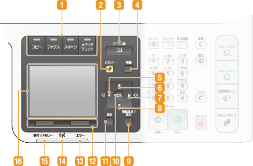 コピーやファクスなどの動作状況、エラー状況などが表示されます。また、設定を行うときもディスプレーを見ながら操作を進めます。