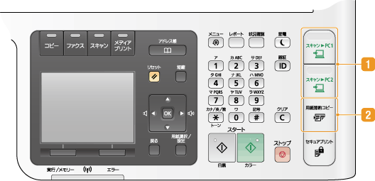 最もかんたんにスキャンできる方法です。「読み込んだデータをどのパソコンに保存するのか」、「原稿をカラーPDFにするのかJPEG画像にするのか」といった設定はあらかじめ各キーに登録しておきます。原稿をセットして または をワンプッシュするだけでスキャンが開始され、指定された画像形式でパソコンに保存されます。 [スキャン > PC]キーを使ってスキャンする
