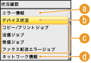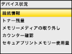 (状況確認)を押すと、印刷や送受信といった文書の状況だけでなく、トナー残量などの本体の状況や、IPアドレスなどのネットワーク設定の情報も確認できる画面が表示されます。