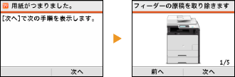 エラー発生時に対処方法が表示されることがあります。画面の指示に従って操作を進めてください。以下の画面は、紙づまりが発生したときの表示例です(