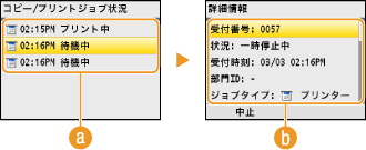 を押す![]() <コピー/プリントジョブ状況>印刷中またはコピー中の文書、順番待ちで待機中の文書などが一覧表示されます。