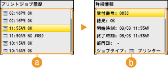 を押す![]() <プリントジョブ履歴>過去に印刷した文書の一覧です。正しく印刷された文書には<OK>と表示されます。<NG>と表示されている場合は、印刷を中止したか、エラーが発生したことを示しています。