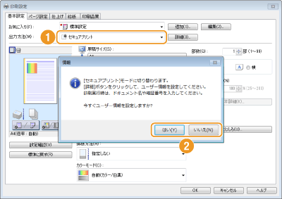 [出力方法]で[セキュアプリント]を選ぶ