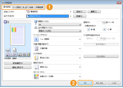 必要に応じて[基本設定]、[ページ設定]、[仕上げ]、[給紙]、[印刷品質]タブから設定を行います。