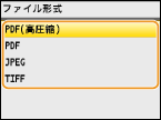 読み込んだ原稿のファイル形式を何にするか選ぶことができます。<PDF>、<PDF(高圧縮)>、<TIFF>*、<JPEG>* の中から選びます。