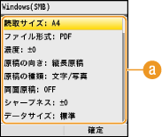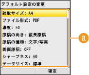 <スキャン設定>    <USBメモリー設定>    <デフォルト設定の変更>    設定項目を選択    選択した項目の初期値を変更  <確定>