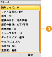 <スキャン設定>    <送信機能設定>    <デフォルト設定の変更>    <Eメール>    設定項目を選択    選択した項目の初期値を変更  <確定>