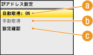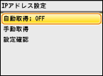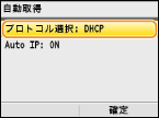 を押したあと、<プロトコル選択>と<Auto IP>を<OFF>に設定します。 |
