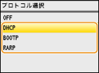 を押す![]() ![]() IPアドレスの自動割り当てにDHCP/BOOTP/RARPを使わないとき <OFF>を選択します。DHCP/BOOTP/RARPを使用できないときにプロトコルを選ぶと、本機はネットワーク内でサービスが提供されているか確認するので、無駄な通信が発生します。