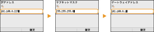 <サブネットマスク> <ゲートウェイアドレス>の順に設定します。それぞれテンキーで入力し、<確定>を押します。