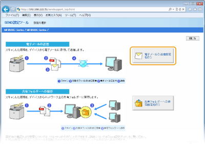 Eメールの送信設定はSEND設定ツールを使って行います。アドレス帳へのEメールアドレスの登録もいっしょにできます。
