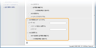 SMTP認証(SMTP AUTH)は、Eメールの送信時にユーザー名とパスワードによるユーザー確認を行います。SMTPサーバーがSSLに対応する場合は、通信を暗号化することもできます。