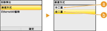 を押したあと、<半二重>または<全二重>を選んで を押します。![]() <半二重>送信/受信を交互に行います。接続するルーターが半二重通信を使うように設定されているときに選びます。
