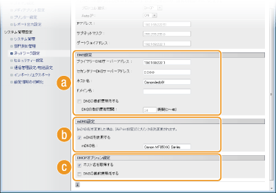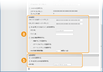 DHCP環境などで、ホスト名とIPアドレスの対応付けが変更されたときに自動更新するにはチェックマークを付けます。DNSサーバーに登録したいアドレスの種類を指定するときは、必要に応じて[手動アドレスを登録する]、[ステートフルアドレスを登録する]、または[ステートレスアドレスを登録する]にチェックマークを付けます。更新間隔を変更するときは、[DNSの動的更新間隔]に時間単位で入力します。 [mDNS設定][mDNSを使用する]