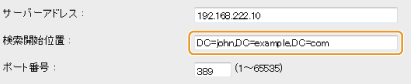 入力するときは、「DC=」にActive Directoryのドメイン名のドット「.」で区切られた文字列(ホスト名)を追加したものを、先頭から順にカンマ「,」で区切ります。たとえばドメイン名が「john.example.com」のときは、「DC=john,DC=example,DC=com」のように入力します。