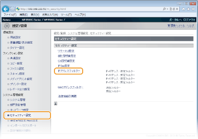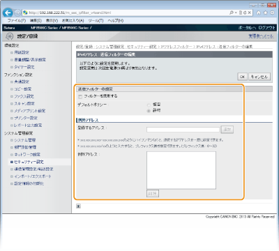 IPアドレスを間違えて設定すると、リモートUIからアクセスできなくなることがあります。この場合は、操作パネルから<IPv4アドレスフィルター>または<IPv6アドレスフィルター>を<OFF>にしてください。 IPv4アドレスフィルター IPv6アドレスフィルター