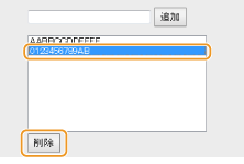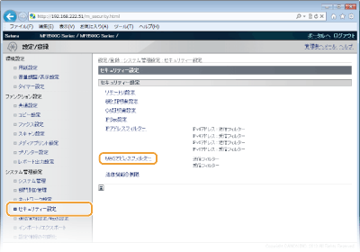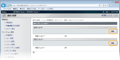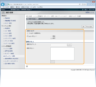 MACアドレスを間違えて設定すると、リモートUIからアクセスできなくなることがあります。この場合は、操作パネルから<MACアドレスフィルター>を<OFF>にしてください。 MACアドレスフィルター