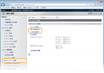 [セキュリティー設定]をクリックし、鍵ペアをインストールするときは[鍵と証明書設定]を、CA証明書をインストールするときは[CA証明書設定]をクリックする