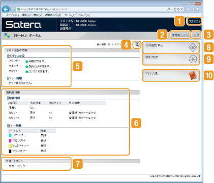 [システム管理]の[デバイス情報]に設定されている本機のサポート情報へのリンクが表示されます。