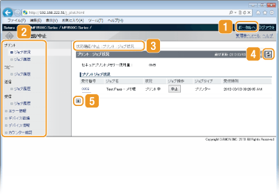 [状況確認/中止]ページが開きます。印刷、コピー、ファクスの待機文書について、状況の確認、履歴の確認、処理の中止ができます。