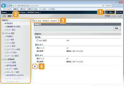 [設定/登録]ページが開きます。管理者モードでログインしているときは、設定内容を変更したり、設定データの保存/読み込みをしたりなどの操作ができます。