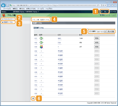 [アドレス帳]ページが開き、登録されている宛先が一覧表示されます。管理者モードでログインしているときは、アドレス帳の登録/編集ができます。