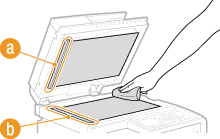 原稿台ガラスやフィーダーの裏面にごみや汚れがあると、原稿や印刷された用紙に汚れが付くことがあります。定期的に清掃してください。