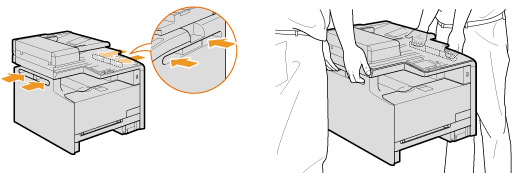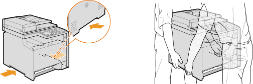 運搬用取っ手をつかんで本体を持ち上げます。オプションの給紙カセット(カセット2)を装着している場合は、本体といっしょに持ち上げずに、別に運んでください。
