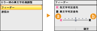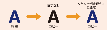 カラーコピーで黒い文字や黒っぽい色の文字が思いどおりにコピーできなかった場合に、コピー結果が原稿により近くなるように調整できます。フィーダーからの読み込みと原稿台ガラスからの読み込みのそれぞれに対して設定できます。