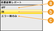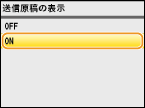 <ON>または<エラー時のみ>を選んだ場合、送信結果レポートに送信文書の一部を表示することができます。<送信原稿の表示>で<ON>を選び、  を押します。