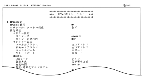 本機に登録されているIPSec設定のポリシー名と設定内容の一覧を確認できます。